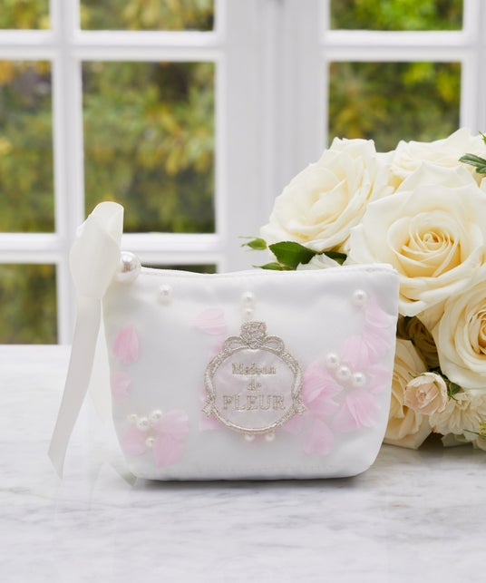 ウェディングドレスの純白のカラーをベースに、フラワーシャワーをイメージした花びらを散りばめ、ベールのようなチュールを上から重ねたトートバッグとポーチが登場。それぞれのフロントには、Maison de FLEURのアイコン“リボン”とブライダルリングをあわせたフレームロゴをシャンパンゴールドのカラーで刺繍しました。