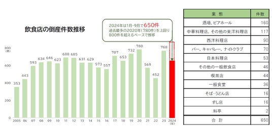 飲食店の倒産が過去最多ペースで発生している。2024年1-9月の倒産件数は650件となり、前年同期比で16.5%増加。このままのペースで推移すると通年の件数は、過去最多の2020年(780件)を上回って870件前後となる見通しだ。