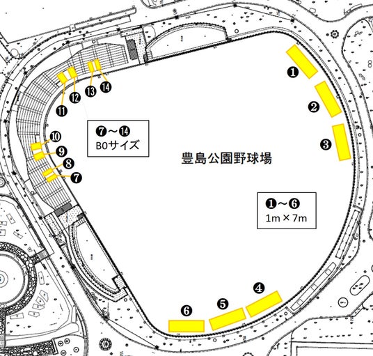 外野ラバーフェンス6区画(1.~6.)、観客席通路8区画(7.~⓮)