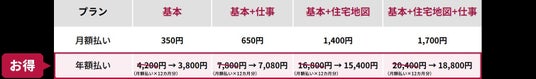 「基本プラン」や「仕事オプション」「ゼンリン住宅地図オプション」を、従来の月額払いよりもお得にご利用いただける「年額払いプラン」を追加しました(税込価格)。