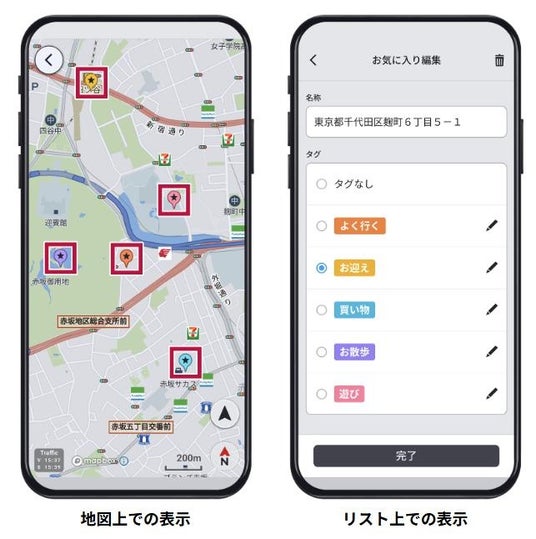 お気に入り登録した場所を、最大6種類のタグに分けて表示できるようになりました。「よく行く場所」や「お迎え場所」「買い物スポット」など、用途に応じたタイトルと色をスマートフォンから自由に登録でき、地図上に表示されるタグアイコンから簡単にルート探索できます。