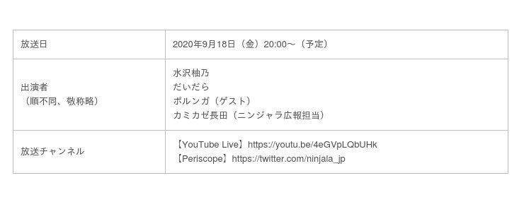 視聴者参加型コミュニティ番組「ニンジャラTV」の次回放送日が2020年9月18日(金)に決定いたしました。