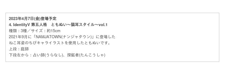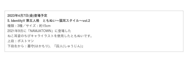『IdentityV 第五人格』のナムコオリジナルプライズが、4月7日(金)より全国の直営アミューズメント施設「namco」とネットクレーンモール「とるモ」に登場します。