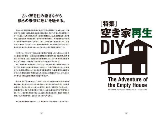 人口減少に伴う地方の過疎化により、社会問題となっているのが、全国で急増する空き家。しかし視点を変えれば、リーズナブルに理想の住処を手に入れるターゲットであり、暮らし方や働き方を再考するきっかけにもなる、大きな可能性を秘めている。160号では、そんな“DIYで楽しむ空き家再生”を特集。修繕ノウハウはもちろん、物件探しのコツや鬼門となる水回りの再生方法、断熱改修など、さまざまな角度から空き家再生をディープに掘り下げました。ぜひ、あなたの「家を住み継ぐ」計画や施工に役立ててください。