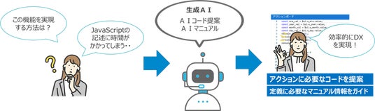 業務ロジックの拡張や外部サービスとの連携については、汎用言語であるJavaScriptの記述により、固有の強みを発揮できるシステムの実現が可能となります。今回のAIコード提案機能では、開発者が日本語でアプリケーションを動作させるための指示を記述すると、生成AIが要求内容のコードに加え、画面に設定された情報を考慮したコードを提案します。これにより、開発生産性が向上し、アプリケーション開発を効率よく進めることが可能になります。