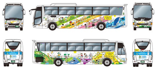 SDGsの達成に向けて、さまざまな人がポジティブな姿勢で取り組む様子と、自然と人々の暮らしが調和するより良い地 域・社会が実現した未来のイメージを、イラストレーターのウマカケバクミコ氏がデザインしました。(上:阪急観光バス 下:阪神バス)