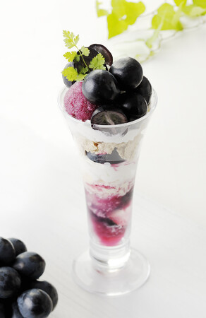 旬のみずみずしいぶどうのおいしさをとじこめた期間限定パフェです。果肉のみずみずしさとグラニテの爽やかな甘み&香りに、アイスやクリームのまろやかな乳味が絶妙のコンビネーション。ヒアルロン酸ジュレ入り。