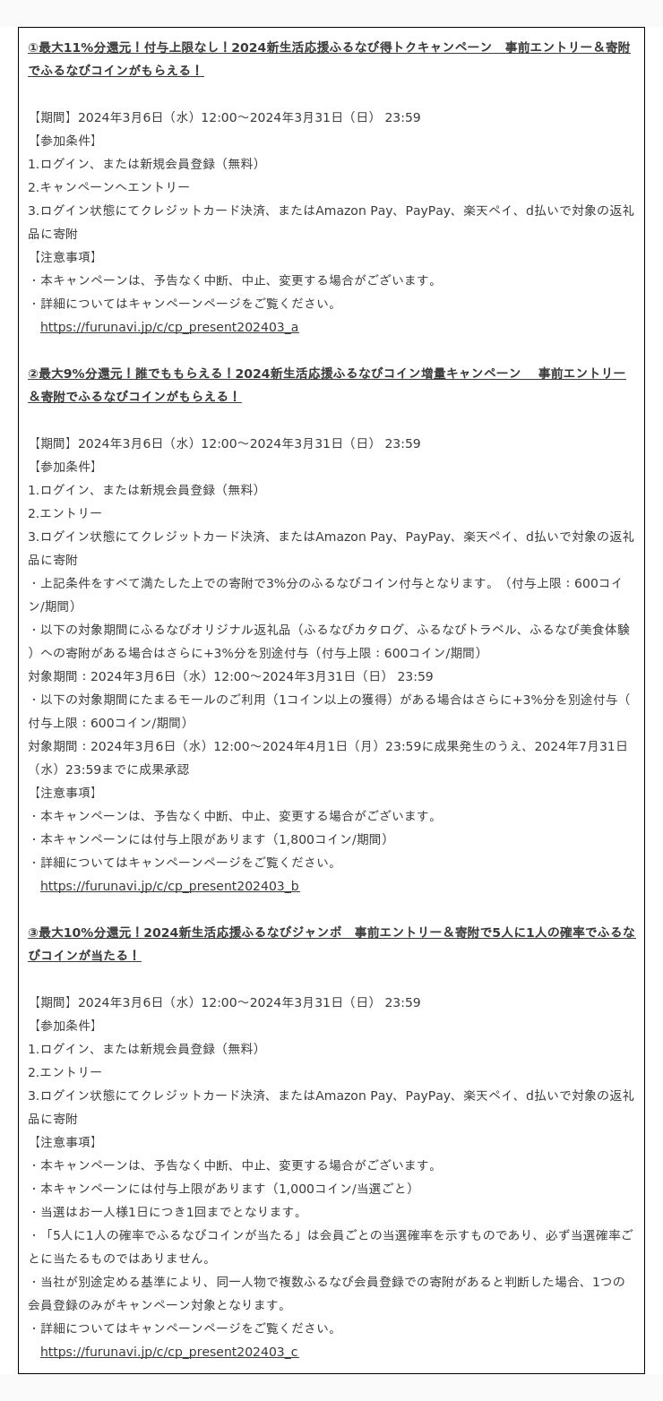 最大30%分還元!2024新生活応援ふるなびメガ還元祭 3つのキャンペーンに事前エントリー&寄附でふるなびコインがもらえる!