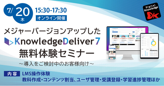 導入実績2000超を誇る 1995年創業のeラーニング専門ソリューション企業、株式会社デジタル・ナレッジ(本社:東京都台東区、代表取締役社長:はが弘明)は、2023年7月20日(木)15時半より、『メジャーバージョンアップしたKnowledgeDeliver7無料体験セミナー ~導入をご検討中のお客様向け~』(https://www.digital-knowledge.co.jp/archives/32823/?pr)をオンライン開催いたします。また、2023年7月12日(水)にはスタジオ収録体験セミナー(https://www.digital-knowledge.co.jp/archives/32828/?pr)を開催いたします。