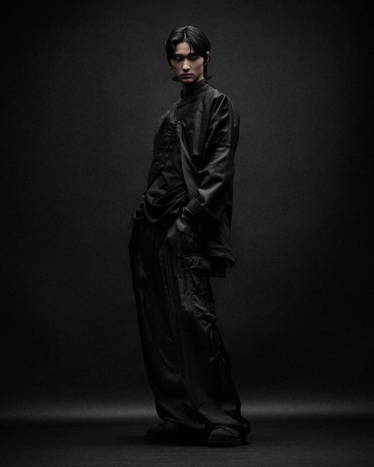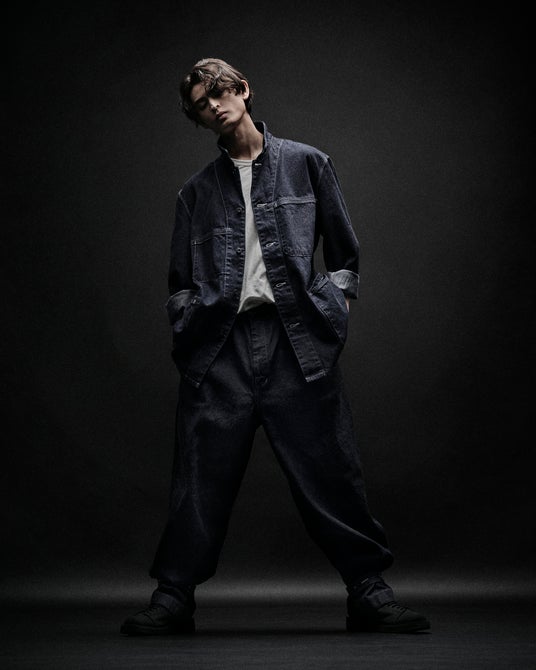 本作のコラボレーションではGround YのパターンメイキングやEDWINのジーンズをベースに白のステッチワークが映えるインディゴデニムと無骨なブラックツイルで登場します。 デニムやツイルのハードな生地はワークテイストに仕上げ、カバーオールやワークジャケット、ペインターパンツなどGround Yらしいゆったりとしたシルエットで表現しました。