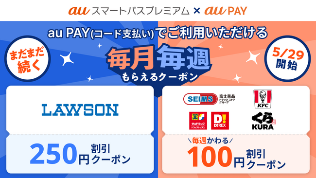 auスマートパスプレミアムでは、引き続きau PAY(コード支払い)で利用可能で、ローソンで251円以上のお買い物が250円割引される「毎月もらえるクーポン」を毎月1日に提供中です。