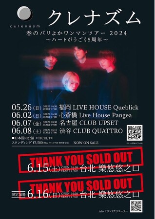 クレナズム 春のバリよかワンマンツアー 2024 ~ハートがうごく5 周年~の台北 樂悠悠之口2days公演の前売りチケットが5分で即完売した。2024年も勢いが止まらないクレナズムのワンマンツアーを見逃すな。