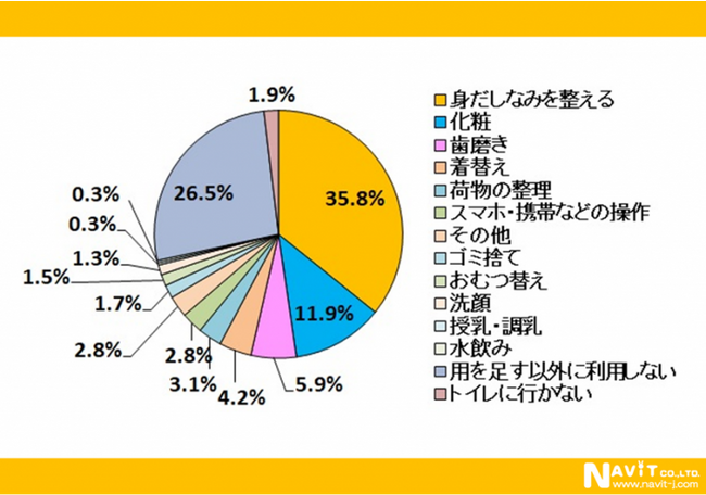 用を足すという目的外でトイレを利用するのは「身だしなみを整える」が最も多く、回答数の35.8%でした。これに次いで「化粧」11.9%、「歯磨き」5.9%、などが挙がる結果となりました。