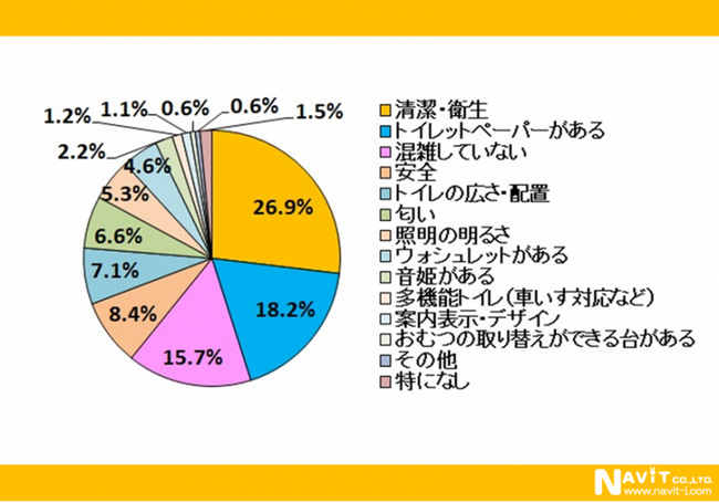 外出時に利用するトイレについては、トップは「清潔・衛生」で回答数の26.9%となりました。2位は「トイレットペーパーがある」18.2%、3位が「混雑していない」15.7%となっています。