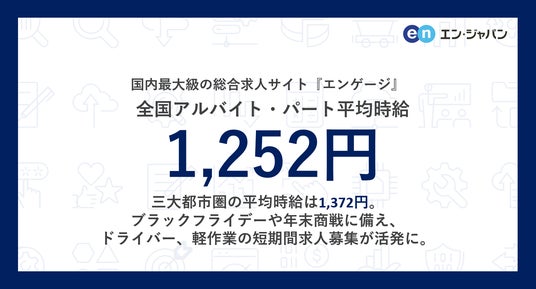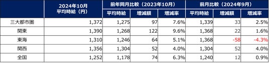 10月度平均時給、三大都市圏は1,372円。全国は1,252円。