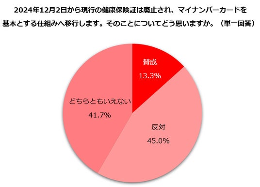 累計の交付枚数が1億を超えたマイナンバーカード。仕事と家庭の両立を希望する主婦・主夫層にマイナンバーカードを所持しているか尋ねると、「持っている」と回答した人が約8割でした。続いて、「あなたはマイナンバーカードを健康保険証として利用していますか」と質問したところ、「利用している」と答えた人は19.8%。マイナンバーカードを「持っている」と回答した人だけに絞っても、利用しているのは25.0%でした。マイナ保険証の普及は、まだ道半ばであることが伺えます。さらに「2024年12月2日から現行の健康保険証は廃止され、マイナンバーカードを基本とする仕組みへ移行します。そのことについてどう思いますか」と尋ねると「賛成」が13.3%であるのに対し、「反対」は45.0%と3倍以上となりました。