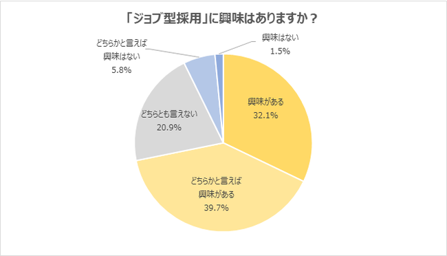「ジョブ型採用」について、「興味がある」と回答した学生が32.1%に上りました。「どちらかと言えば興味がある」39.7%を合わせると、7割以上の学生が「ジョブ型採用」に興味を持っていることが分かります。「成果に応じた給与体制」に魅力を感じる学生が多いことと併せて、「ジョブ型採用」にも関心が集まっていることがうかがえます。