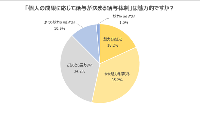 「個人の成果に応じて給与が決まる給与体制」について、「魅力を感じる」と回答した学生が18.2%に上りました。「やや魅力を感じる」35.2%を合わせると、半数以上の学生が「個人の成果に応じて給与が決まる」仕組みに魅力を感じていることが分かります。「仕事を頑張ったり、スキルを磨くモチベーションになる」「自身の仕事や能力が評価されると嬉しく思う」「魅力的に感じるが、評価制度が明確であることが重要だと思う」といった声が寄せられました。