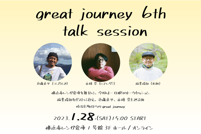 2016年にはじまった「great journey」は、ダンス集団・コンドルズを主宰しダンスを軸に演劇、映画、テレビなど多角的に活躍する近藤良平と、ハナレグミ名義で2002年からソロ活動をスタートし、シンガーとして、作曲家・作詞家としても第一線で活躍する永積 崇が、毎年一回、横浜赤レンガ倉庫に集い観客と一緒になってつくり上げる人気シリーズです。6回目となる今回は、「いのちの居場所」等の執筆活動や文化芸術分野でも活躍する医学博士・稲葉俊郎をゲストに迎えて、3人で一日限りのトークセッションを繰り広げます。当日赤レンガ倉庫の空間で参加する方法、後日オンラインで視聴する方法の2つを用意しました。