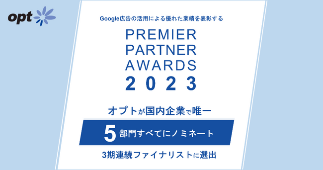 「デジタルで、この国の新しい基本をつくる。」をミッションに掲げ、顧客の事業成長に伴走する株式会社オプト(本社:東京都千代田区、代表取締役社長 CEO:栗本 聖也、以下、オプト)は、本年9月5日(火)に発表されたグーグル合同会社(以下、Google社)が実施する、Google広告を活用したデジタルマーケティングにおいて優れた実績を表彰する「Premier Partner Awards 2023(※1)」にて、国内で唯一、5部門すべてにノミネートされたことをお知らせいたします。