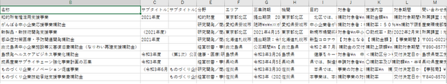 項目例)名称/分野/エリア/支援内容/公募終了日
