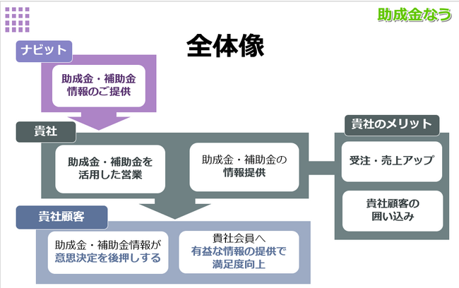 株式会社ナビット(東京都千代田区九段南、代表取締役:福井泰代)が運営する「助成金なう」では、助成金・補助金・給付金の情報発信や申請サポートを承っております。6月8日(木)より、商材に合った補助金データのサンプルを先着30社限定でプレゼントするキャンペーンを実施いたします。