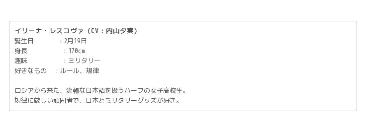第1弾として、浅木泉水(CV:新田ひより)、榊亜矢香(CV:鳥部万里子)、イリーナ・レスコヴァ(CV:内山夕実)を公開します。