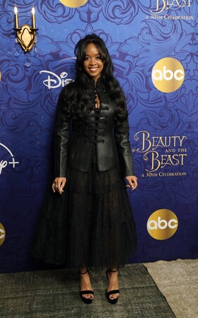 2022年12月13日 ロサンゼルスにて行われた映画『美女と野獣』の公開30周年を祝うセレブレーションにH.E.R.が出席。2023年クルーズより、ブラックレザーのジャケットとレーススカートを纏いました。