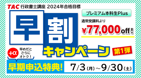 行政書士試験対策講座を展開しているTAC株式会社(東京都千代田区、代表取締役:多田敏男)は、余裕をもった学習スタートで着実に合格を目指す初学者向けコース「2024年合格目標 プレミアム本科生Plus」を7月より順次開講いたします。また、期間限定キャンペーンとして通常受講料より77,000円割引となる『早割キャンペーン第1弾』に加えて、『早期申込特典』を9/30(土)まで実施いたします。