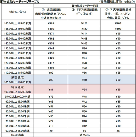 JALは日本発国際貨物燃油サーチャージの改定時期を年12回(毎月)としており、また、各月の貨物燃油サーチャージ額は「シンガポールで取り引きされるジェット燃油(ケロシン)価格の前々月の平均値」を燃油指標価格として、2022年4月より導入した以下テーブルに従いサーチャージ額を決定します。