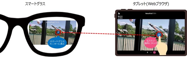 「RemoPick™」はスマートグラスやタブレットなどを用いて遠隔地をリアルタイムで繋ぎ、よりスムーズなコミュニケーションを可能とする次世代サービスです。スマートグラスなどの送信側端末の専用アプリケーションから送られる映像・音声を視聴側端末のWEBブラウザに表示します。視聴側で映像にタッチすると、ポインターが表示され、そのポインターは送信側端末のモニターで確認することができるため、遠隔でのコミュニケーションを円滑にし、新たな価値を提供します。