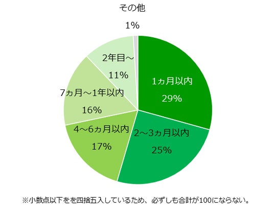 これまでにギャップが原因で仕事を辞めたことがある方に、退職したお仕事での入社から退職までの期間を伺うと、最多は「1ヵ月以内」で29%、次いで「2~3ヵ月以内」(25%)、「4~6ヵ月以内」(17%)が続きます。就業前後にギャップを感じた方は、入社半年以内の離職が多いことがわかりました。