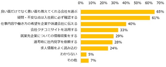 ギャップのない就業をするために有効だと思うのはどんなことか伺うと、上位は「良い面だけでなく悪い面も教えてくれる会社を選ぶ」(65%)、「疑問・不安な点は入社前に必ず確認する」(61%)でした。
