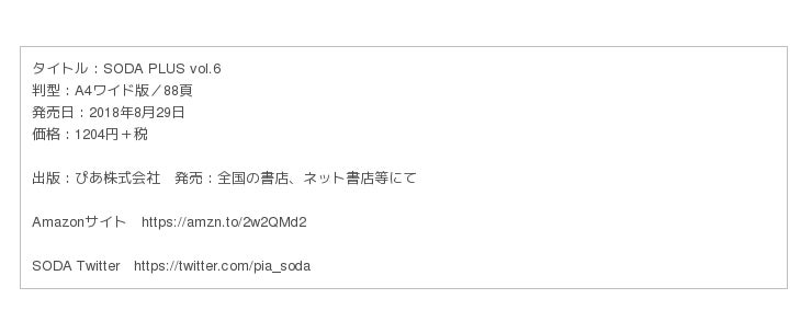 明日8月29日に、ぴあ株式会社より『SODA PLUS vol.6』が発売となります。