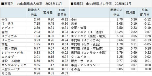 パーソルキャリア株式会社が運営する転職サービス「doda(デューダ)」(編集長:桜井 貴史)は、2025年11月の転職求人倍率をまとめた「doda転職求人倍率」を発表いたします。