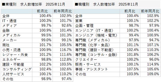 求人数は、業種別では12業種(「その他」は除外)のうち8業種で前月から増加しました。最も増加率が大きかったのは「コンサルティング」(前月比102.4%)、次いで「建設・不動産」(前月比102.2%)でした。職種別でも11職種(「その他」は除外)のうち8職種で前月から増加しました。最も増加率が大きかったのは「事務・アシスタント」(前月比107.5%)、次いで「専門職(建設・不動産)」(前月比102.4%)でした。