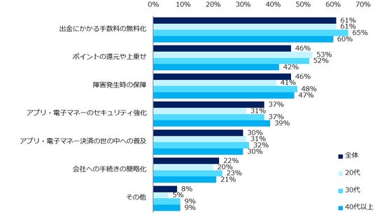 続いて、給与のデジタル払いを「利用したくない」と回答された方に「どんな条件が揃えば、今後“給与のデジタル払い”を利用してもよいと思いますか?」と伺うと、全年代でトップは「出金にかかる手数料の無料化」(20代:61%、30代:65%、40代以上:60%)でした。「ポイントの還元や上乗せ」では、30代以下(20代:53%、30代:52%)と40代以上(42%)で10ポイント以上差が出る結果となりました。