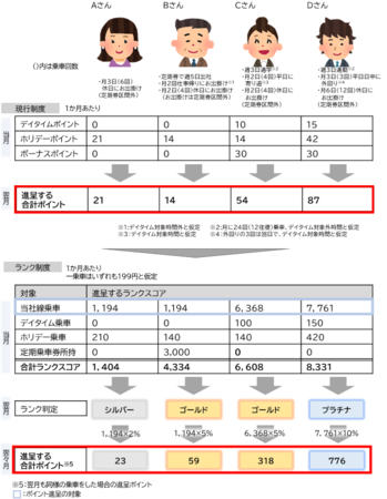 平日日中や土日祝日にご利用いただいたお客様はさらにランクアップしやすい内容となっており、一定以上ご利用いただければ、乗れば乗るほどお得にご利用いただけるサービスとなっております。