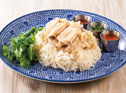 「カオマンガイ」とはじっくり茹でた鶏と、鶏がらスープで炊いたジャスミンライスをソースとともに食べるタイの定番屋台料理。