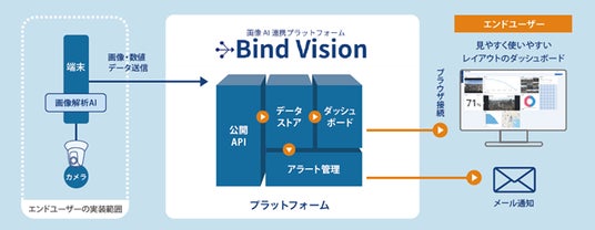画像AI連携プラットフォーム「Bind Vision」は、画像解析AIシステムで大きな割合を占めるWebシステム開発部分をクラウド提供するサービスです。