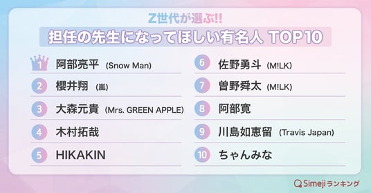 今回のテーマは、Z世代が選ぶ!!「担任の先生になってほしい有名人TOP10」