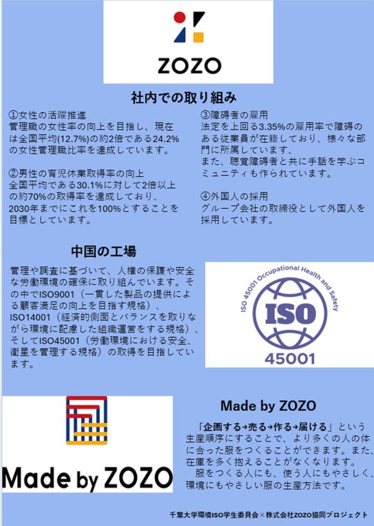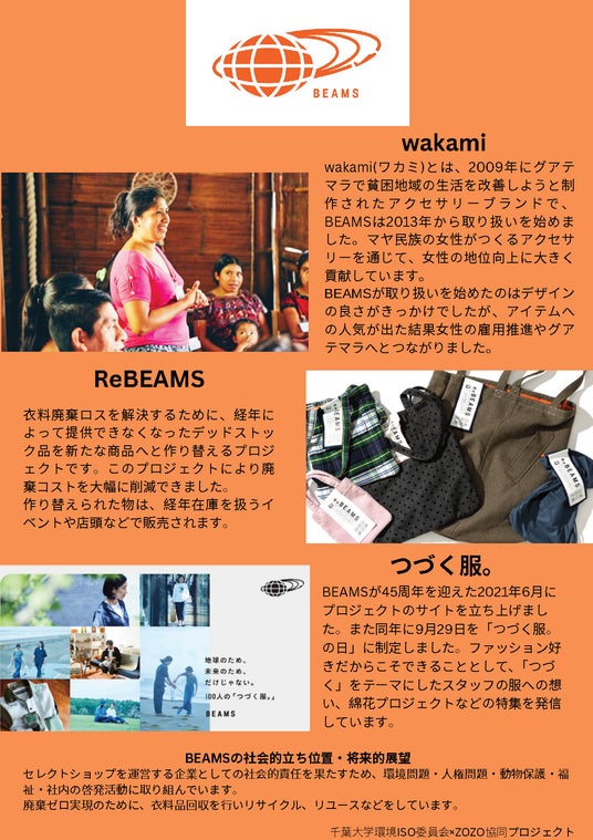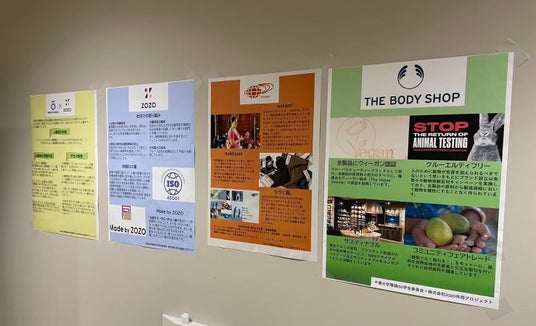 人権班では「ファッションにおける人権問題について自らの学びを深めると共に、1人でも多くの人に人権問題を自分事として考えてもらうこと」を目標に、まずはメンバーへのインプットとして勉強会を実施しました。各自が興味のある人権問題や取材する企業の取り組みについて調べて共有しあいました。その後、ZOZO生産プラットフォーム部と、BEAMS(株式会社ビームスホールディングス)および、THE BODY SHOP(ザボディショップジャパン株式会社)の2つのブランドを取材し、その内容をパネルにまとめてChiba Winter Fesで展示しました。