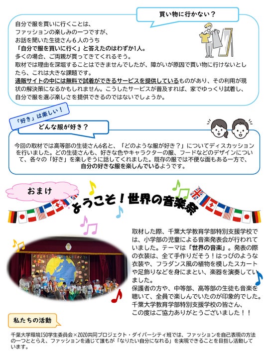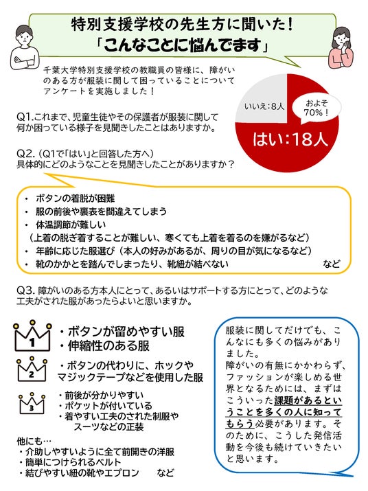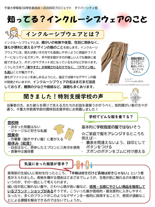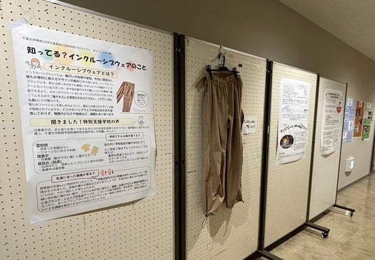 障がいを理由にファッションを楽しめない人がいることや、インクルーシブウェアについて広く知ってもらうため、まずは、千葉大学教育学部附属特別支援学校の教員に取材をしました。その内容とインクルーシブウェアについてまとめたパネルを、Chiba Winter Fesで展示しました。