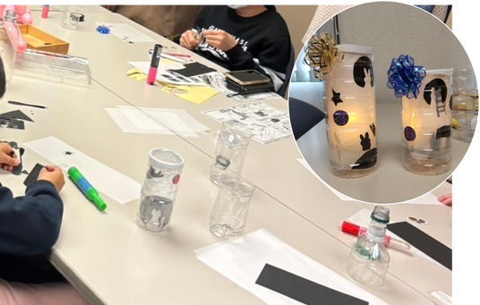 ペットボトルランタンづくり飲み終わったペットボトルを切って、好きな切り絵をアレンジして飾りつけ、LEDライトを入れて完成するランタンです。防災用にも使用できます。ワークショップはとても人気で用意していた50組分は午前中で終了しました。
