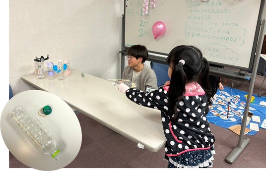 ペットボトルを用いた的あてゲームペットボトルと割りばしとゴムを使いキャップを飛ばして的あてをするゲームです。参加した子どもたちは夢中になって何度も挑戦していました。