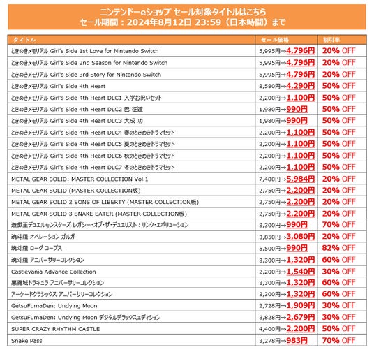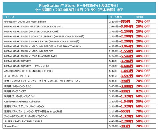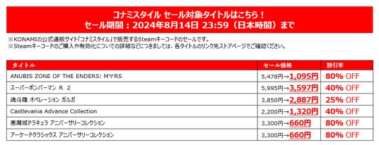 株式会社コナミデジタルエンタテインメント(以下、KONAMI)は、ニンテンドーeショップ、PlayStation(TM) Store、コナミスタイル(KONAMI STYLE)で、ダウンロード版のゲームをお得に購入できるKONAMI「サマーセール Part.2」を開催中です。
