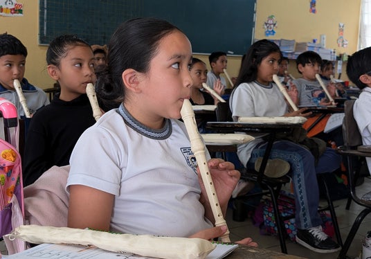 ヤマハ株式会社(以下、当社)が支援する、メキシコ合衆国(以下、メキシコ)でのリコーダーを用いた音楽教育のパイロット授業が、2025年2月に開始されました。本パイロット授業は、2024年11月にメキシコ州教育科学技術革新省(Secretaria de Educacion, Ciencia, Tecnologia e Innovacion)と締結された音楽教育を通じた非認知能力の育成に関する協力覚書に基づくもので、メキシコ州公立初等学校18校の正規授業内で第4学年の児童1,140名を対象に実施されます。