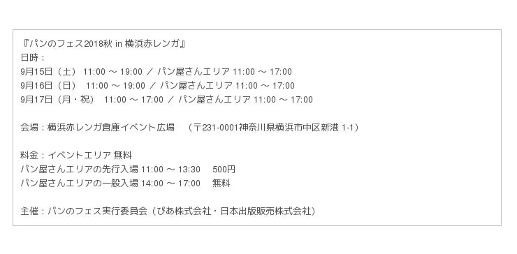 レジャー・エンタテインメントのチケット販売及び各種イベントの企画・運営等を行うぴあ株式会社(代表取締役社長 矢内 廣)と、出版取次で「パンシェルジュ検定」を運営する日本出版販売株式会社(代表取締役社長 平林 彰)は、2018 年9月15日(土) ~ 17日(月・祝)の3日間、横浜赤レンガ倉庫イベント広場にて「パンのフェス2018秋 in 横浜赤レンガ」を共同で開催。このたび「パンのフェス」初出店となるパン屋さんよりコメントが到着しました。