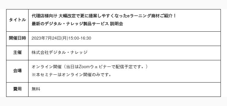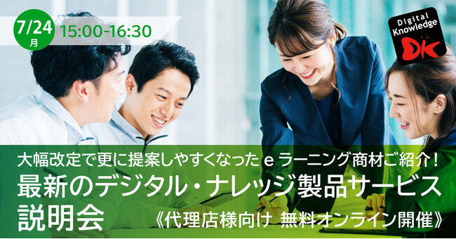導入実績2000超を誇る 1995年創業のeラーニング専門ソリューション企業、株式会社デジタル・ナレッジ(本社:東京都台東区、代表取締役社長:はが弘明)は、2023年7月24日(月)、「代理店様向け 大幅改定で更に提案しやすくなったeラーニング商材ご紹介!最新のデジタル・ナレッジ製品サービス 説明会」をオンライン開催いたします(https://www.digital-knowledge.co.jp/archives/33074/?pr)。