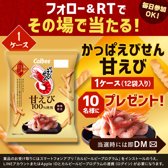 「かっぱえびせん」公式Twitterアカウントをフォローの上、キャンペーン投稿のリツイートをしていただいた方の中から抽選で『かっぱえびせん 甘えび』をプレゼントするキャンペーンを実施します。